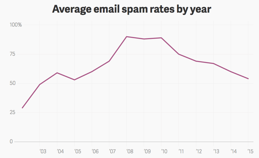The worry of course is that the effectiveness of email will cause marketers to ruin it with overuse. As more and more attempt to use the platform users will feel increasingly bombarded and start to ignore emails, or simply unsubscribe. But new stats from Atlas shows the rate of 'spam' email has actually now reached a 10 year low.