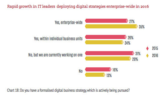 Interestingly, many of those that had developed a digital strategy hadn't managed to implement it across the whole company, with a quarter of businesses only implementing digital strategies within individual business units. This is better than no strategy at all, but can lead to silos developing where knowledge gained is not shared across the business. IT leaders need to aim for fully integrated digital strategies which span the whole company in 2016. With 87% of businesses either working on a digital strategy or already implementing it, not developing one is a recipe for falling behind.