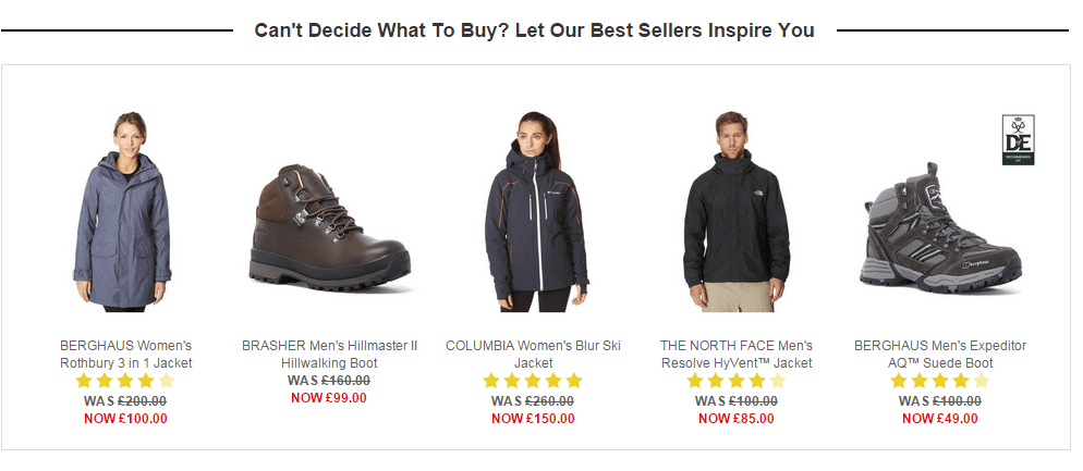 Since it's not practical to create rule-based recommendations for all systems, auto-generated recommendations are essential too. In this example from Millets, a selection of top-sellers are automatically presented.