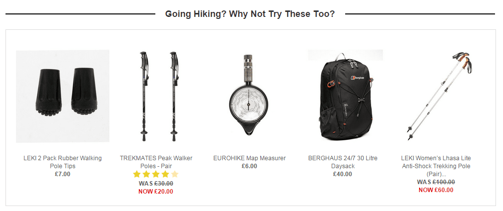 The Barilliance product recommendations engine makes recommendations based on the intent and preferences of each visitor based on the page types they browse and product categories they interact with. More than 20 types of product recommendations are automatically presented to site visitors on category pages, product pages and basket pages. In addition to the auto-generated product recommendations, the teams at Millets and Blacks also create up-sell and cross sell merchandising campaigns that override the auto recommendations.