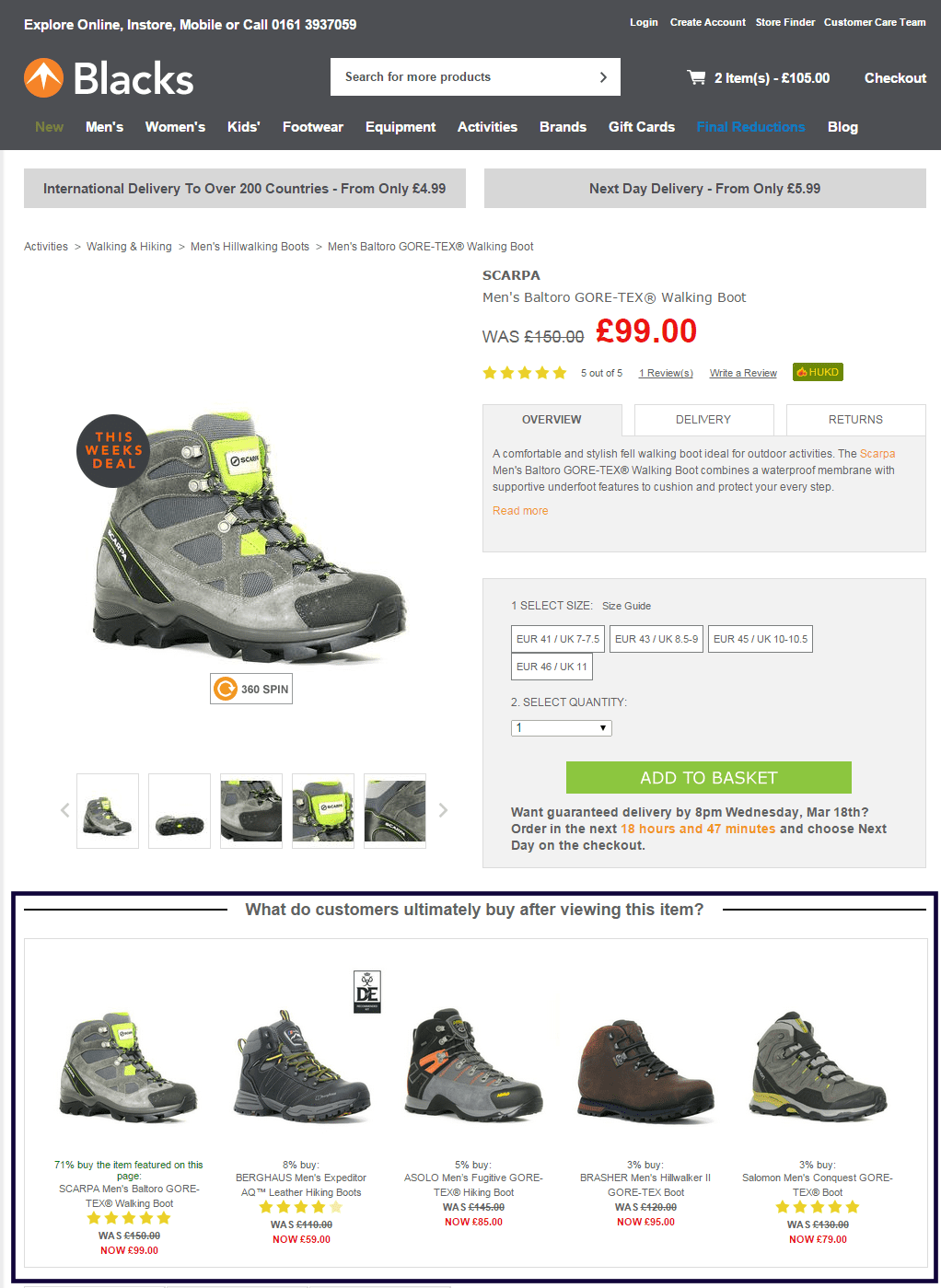 “Compared to average site conversion rate, conversion rates were increased by 332% on Millets.co.uk and 277% Blacks.co.uk where a visitor selected a personalised product recommendation. The proportion of site revenue from product recommendations is significant, accounting for nearly one fifth of all sales (19.0% at Millets 16.9% at Blacks)”.