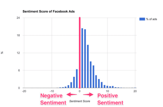 Sentiment analysis of the 111,800 ads analysed shows neutral or slightly positive tones are the most common for Facebook ads. This may because neutral ads really do work better on Facebook, or it may because of risk-adverse strategies on the part of advertisers. Studies show emotional content tends to be far more memorable, and we recommend a 70:20.10 split between Safe, moderately risky and genuinely risky content. Controversial content often generates massive amounts of publicity and can be extremely effective, provided you don't go too far and end up giving your PR department a headache!