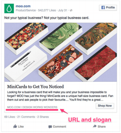 Seen as your paying for the ad, you may as well take the opportunity to promote your brand and your domain, by including it in the ad. Most advertisers on Facebook do so, and 11% use the text option on the domain URL to include further text or a tagline, which can be effective.