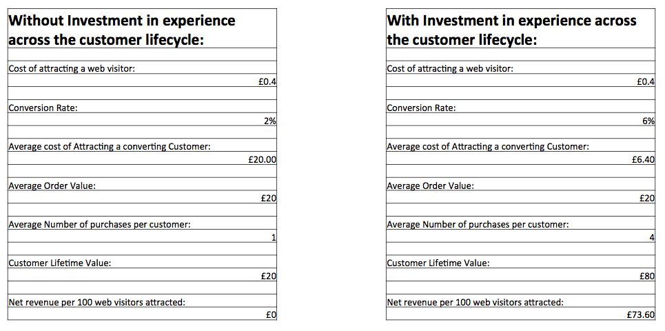 In this hypothetical scenario, the person who invested in a better experience across the customer lifecycle was rewarded with an increased conversation rate and customers willing to buy from the brand again on several occasions. Though in both scenarios the average order value and the average cost of attracting web visitors is the same, the business which has invested in customer experience across the lifecycle could generate significant profits from attracting customers, whilst the other business cannot generate a profit.