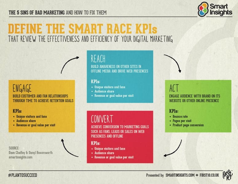 It also maps the customer lifecycle across the RACE framework, which helps you break down you plan your activities and structure your KPIs for different departments or teams working to boost varying aspects of the customer lifecycle. The diagram below gives more clarity as to the KPIs you will want to consider and how they are divided into Reach, Act, Convert and Engage.