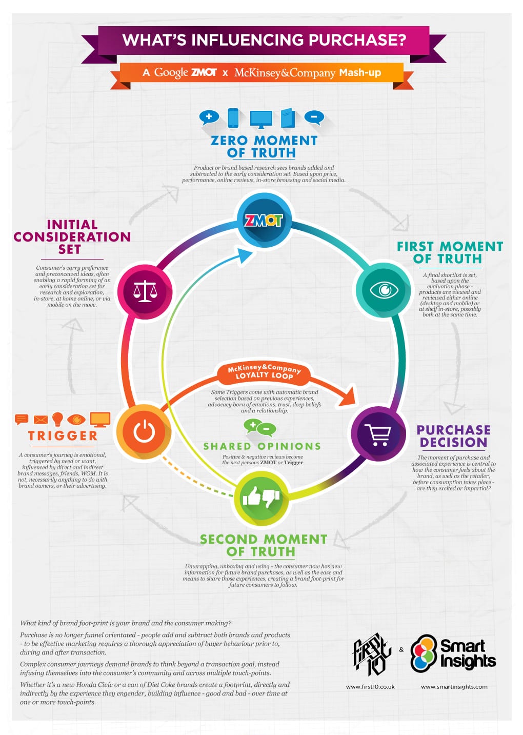 The diagram below we developed by using Google's ZMOT model and McKingsey & Company's customer decision journey- which includes the all important 'loyalty loop'. It helps marketers consider how customers make the all important decision to purchase and how marketers can successfully nudge them into becoming a repeat customer.