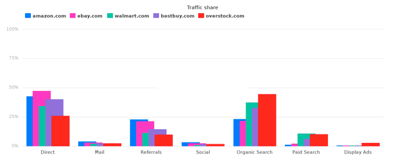 Ebay has the strongest graph when it comes to direct traffic, closely followed by Amazon. Overstock’s organic search traffic is the most and direct traffic the least as compared to its competitors. This is indicative of a developing brand in the sector. This is further confirmed by Overstock leading the display ad traffic segment and closely following Walmart in paid search traffic segment. Visual aid is always a good support structure for developing brand recall. (Remember the traffic driven to these websites on a daily basis is in the millions therefore we have a significant sample size). A strong brand here should correlate with direct traffic values. The consumer is likely flock to either one of Amazon, eBay, Walmart, Best Buy or Overstock for all their online shopping needs.