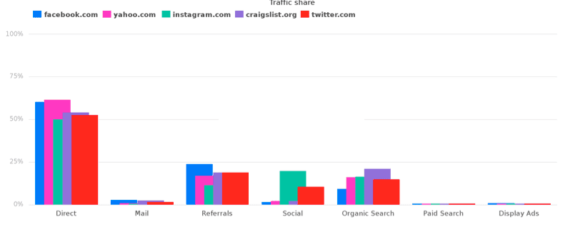 Direct traffic share is towering significantly above the rest of the traffic drivers. All the brands above are operating at above 50% direct traffic share. Yahoo and Facebook are in close competition at around 61%. This shows the recall value and also awareness that these brands hold in the minds of their consumers. (Again please note that traffic values are in the millions per day therefore highly significant numbers).