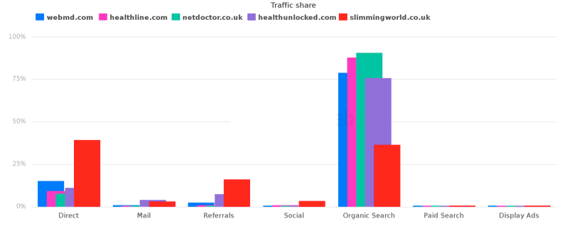 This is the “normal” in this realm and it is doubtful that it will ever be overcome as these sectors are playing within the perpetual information discovery phase of the audience. Ideally, a strong brand in this sector should have very high direct traffic, strongly indicating that people trust this brand to give them the best of everything. In this case the best fitness news, disease prevention advice, drug related information, the best user experience or anything else a consumer thinks is worth their time and effort. This is also called “brand equity”, this is what the consumer is willing to forego when it chooses one brand over the other but this will never be the case here.