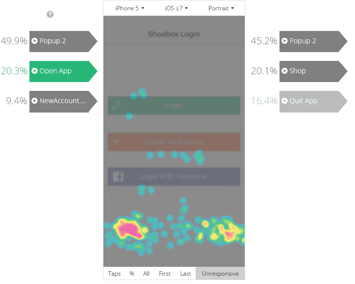 Another important capability is that it spots unresponsive gestures that usually severely hurt the overall user experience and could have your users abandoning the app in flocks. Heatmaps can help you understand if users are ignoring certain CTAs or if there are user interface elements that don’t feel intuitive. It can show you which parts of the screen your users find most interesting, and could prove useful in A/B testing.