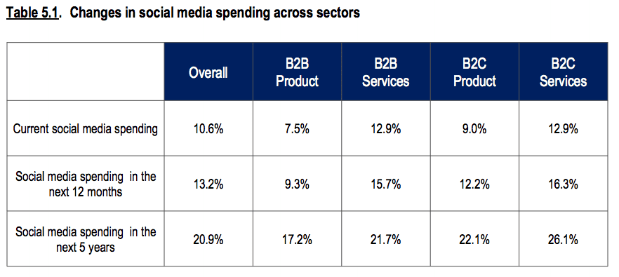 Social media spend is set to increase markedly in the next few years: doubling from 10% of today's marketing budgets to 20% by 2021. B2C services leads the pack when it comes to % of marketing budget on social, with over a quarter of budget to be dedicated to the channel in 5 years time.