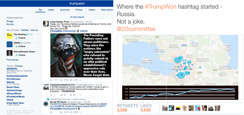 It was not a lone incident. During the head-to-head televised debates, the majority of polls and focus groups agreed that Clinton won the arguments. Coincidently during the debates, the hashtag #TrumpWon started appearing on Twitter. According to the BBC these turned out to be automated purely by bots. Other reports suggested that human – generated bots feigning to be actual people like New York mothers with kids, actually emanated from a troll farm in St Petersburg, Russia.