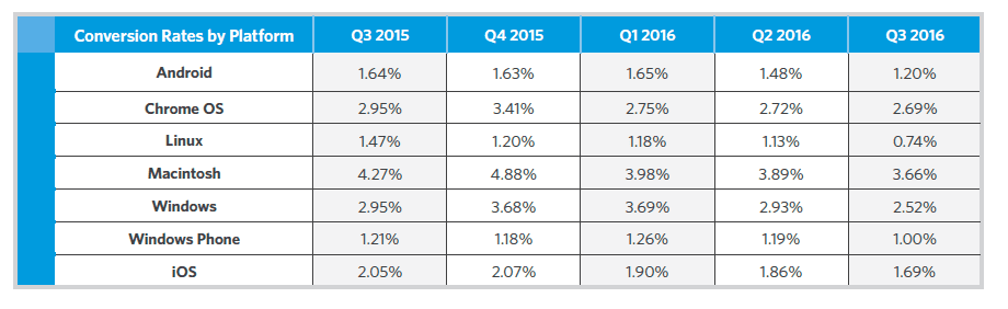 This suggests smartphones are more of browse or research platform rather than a buy platform since many of the large retailers featured in this survey will have mobile optimised sites. Smartphone experiences should be personalised to show this different form of usage. The lower conversion rates for mobile devices are also shown in these compilations of Android vs MacOS vs iOS operating systems.