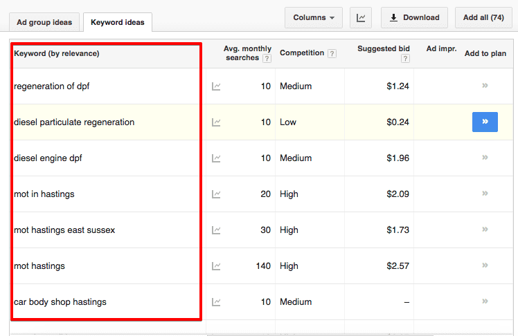 The second task is to find out long tail variations of these keywords. “Clutch Repairs” is a very common keyword, and there are probably thousands of pages competing for it. What about “Clutch Repairs in East Sussex” or “Clutch repairs for Chevy 1992 Camaro”? These are called long tail keywords. The search volume for these keywords might be much lower than the core keywords but they are very intent-heavy and typically have much lower competition.