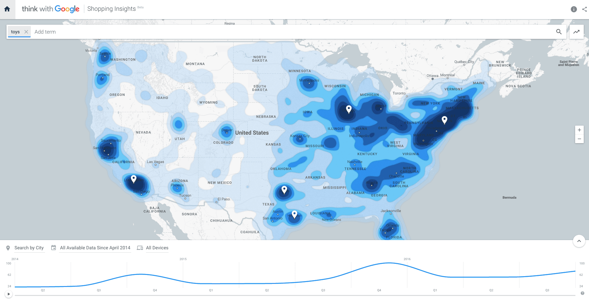 I was browsing for the must-have toys of 2016 and stumbled across an amazing tool from Think with Google - Shopping Insights. This tool is still in beta but has a wealth of data allowing you to explore trends and popularity of consumer products across the U.S.