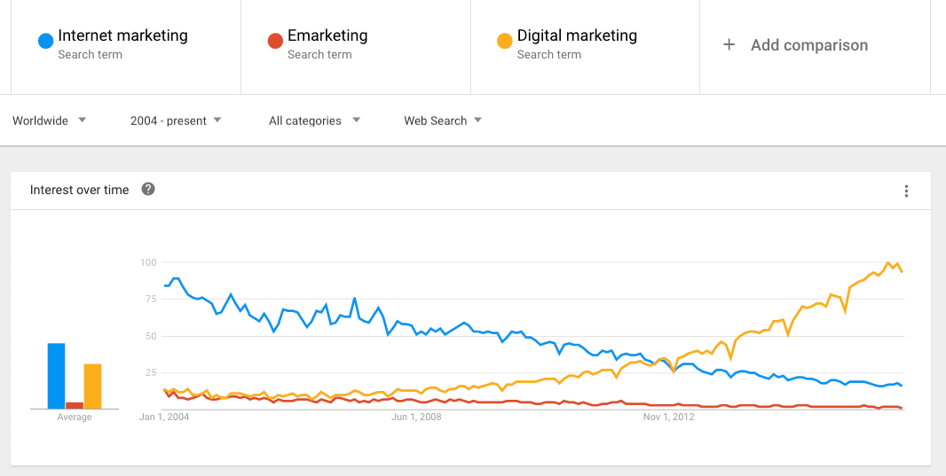 Before Digital marketing became the de-facto term, I've been asked this question a lot across the years... does the difference in scope between these terms matter? So, as we enter 2017, I thought it's time for another quick look. Here is the latest comparison from Google Trends between 2004 to end 2016.