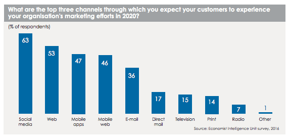 So with that in mind, think about this chart of what CMOs think will be the key marketing channels for their businesses in 2020. Social leads the pack, and mobile apps and mobile web are 3rd and 4th. Does this reflect your current investment priorities? Investing in the channels of the future today and not at a later date is the only way to ensure you don't fall behind.