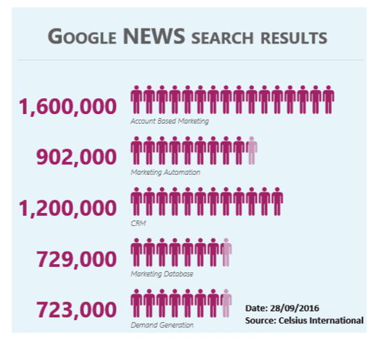If we also take a look at it’s popularity in the news, compared to other popular marketing topics, we see ABM is 40% more popular than CRM and almost twice as popular as marketing automation.