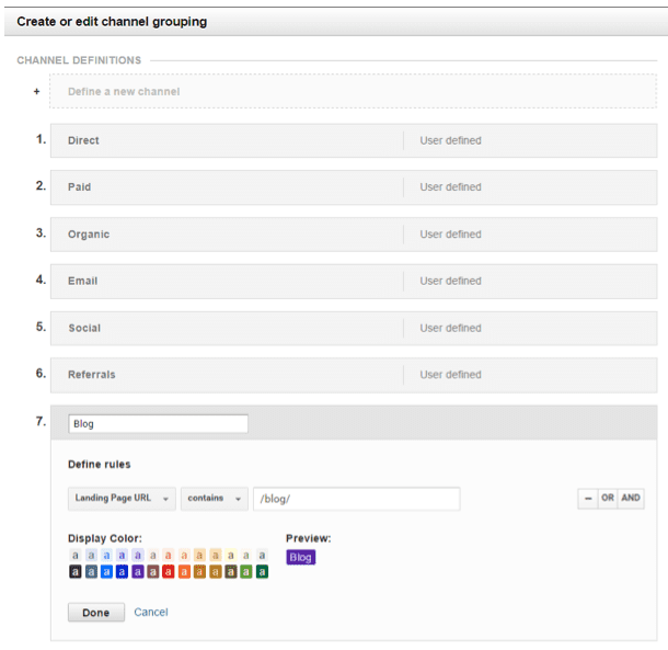Again, this is an area that has been covered before on Smart Insights. Effectively, this allows you to define new channels that can be queried in the same as the way as those preset in Analytics, which are: