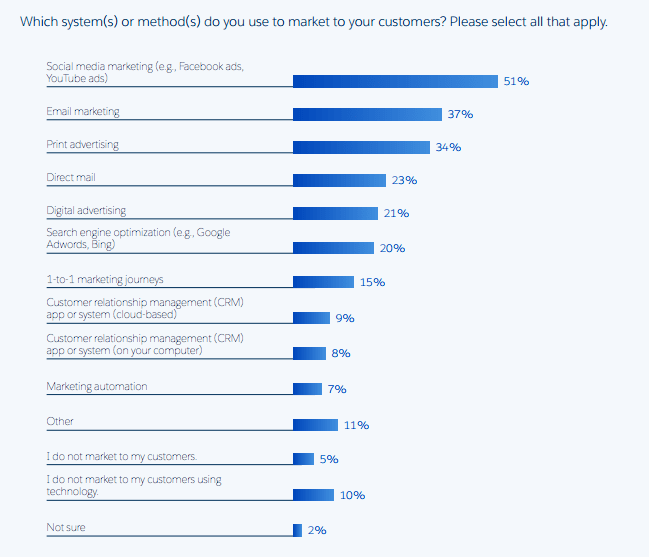 Salesforce, a content partner of SmartInsights, surveyed 300 small business owners (defined as businesses with less than 100 employees. They found that whilst some marketing techniques such as social media and email marketing were very popular, the vast majority of small businesses were failing to use more advanced techniques which could deliver more value. 93% did not use marketing automation, and 91% did not use a cloud-based CRM system. 4 out of 5 businesses said they did not use any SEO techniques, and only 21% used digital advertising.