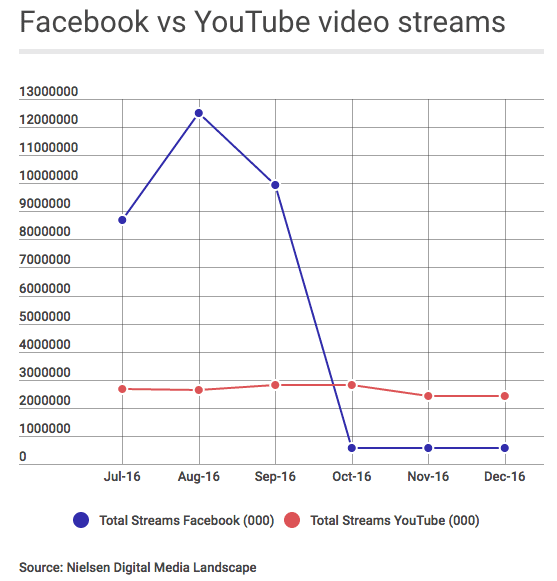 Now new viewing data from Nielsen has shown that since Facebook fixed the error causing it to wrongly inflate viewing counts, the true viewing figures for Facebook's video views are far below that of YouTube. In fact, they're less than half. So it's clear that Facebook has never really been a serious challenge to YouTube's crown as the king of online video.
