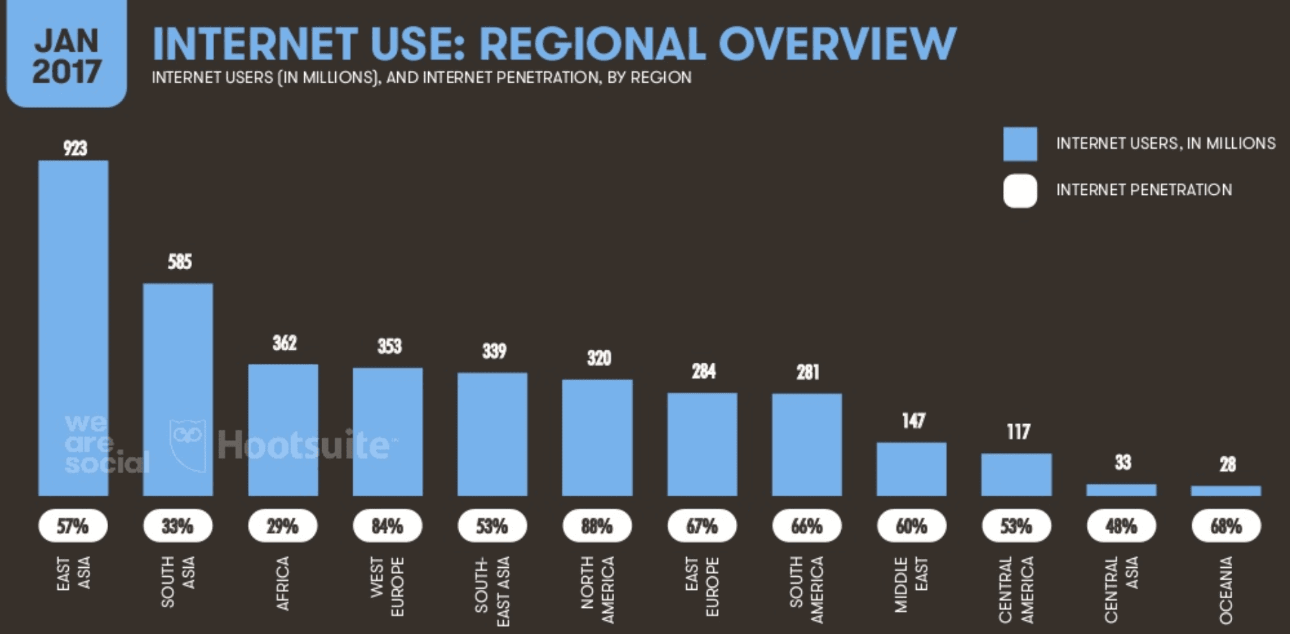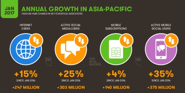Asia-Pacific is driving much of this growth, which internet usage rates high and number of active social media users increasing 14% on the year before.