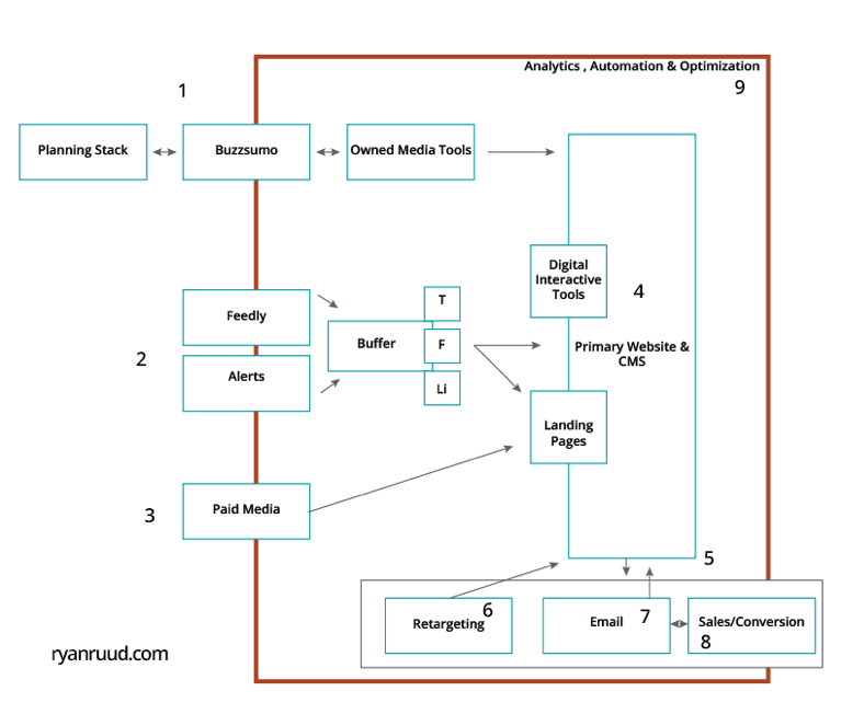 The framework I have, is a hybrid. I align my framework to planning and customer journey. Simple works for me, I haven’t encountered an industry or product it can’t adapt to. I look at 6 stages of a marketing tech stack: planning, attract (or awareness) conversion, nurture, close and analytics/automation.