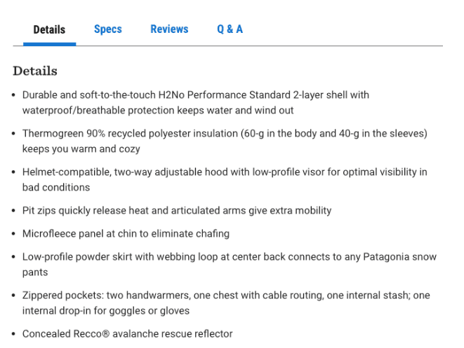 REI could, technically, put all the "Details," "Specs," "Reviews and "Q&A" in a long section of the product page. The display above, though, is more manageable. This ensures you don't overwhelm your visitors (especially with more complex products) as soon as you arrive on the page.