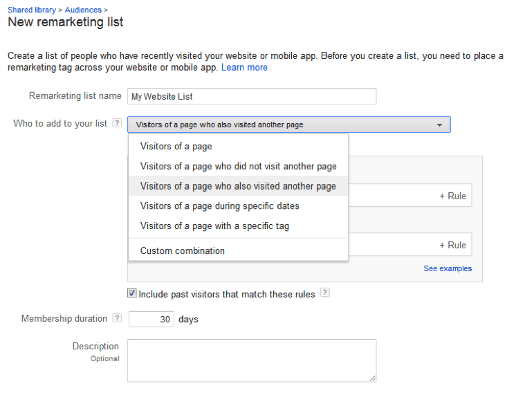 Google’s retargeting options allows you to retarget in a number of inventive ways. You can retarget based on the specific behaviours of your visitor, the specific pages they visited, whether or not they viewed more than one page, the date they first landed on your page and users who have a specific tag. Google's remarketing options are perfect for targeting people based on their interactions with your website.