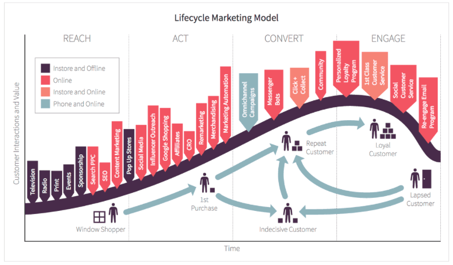 It is the need of the time to integrate online and offline marketing techniques. You can use the strong network built by offline marketing techniques to increase your page views. The increased traffic can be helpful in generating more sales through a right content marketing approach. The chart below shows consumer touch points across the customer lifecycle, both on and offline.