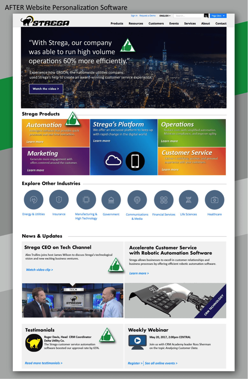 Strega provides software solutions to a variety of businesses for marketing, sales automation, customer service, accounting, and CRM. Strega has hired a new marketing director, who recognizes the importance of quality personalization. As a B2B solution, in the past, Strega always considered their visitors to be less convenience-driven than typical end-consumers, but recent B2B market research has debunked that idea; having dynamically personalized content can boost sales just as much, regardless of whether your customers are other businesses or end users, particularly when conducting an Account-Based Marketing strategy.