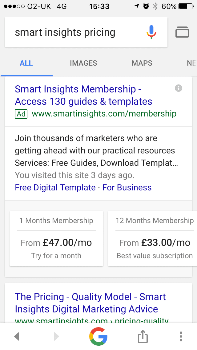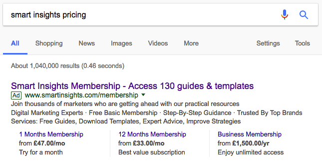 Here at Smart Insights we have been trialing the pricing ad extensions on our brand campaign in the UK. It is too early to tell if the impact of this feature will provide a great enough ROI. So far it's looking positive, but I will keep you posted in a few weeks time.