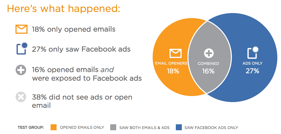 - When reached with Facebook ads, email openers were 8% more likely to click on email.