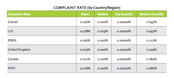 Finally, from this benchmark, I thought it would be useful to share the data on list churn as indicated by hard bounce rates and spam complaint rates. You don't want to go too high on these since you could have a problem with inbox delivery and likely your ESP will get in touch.