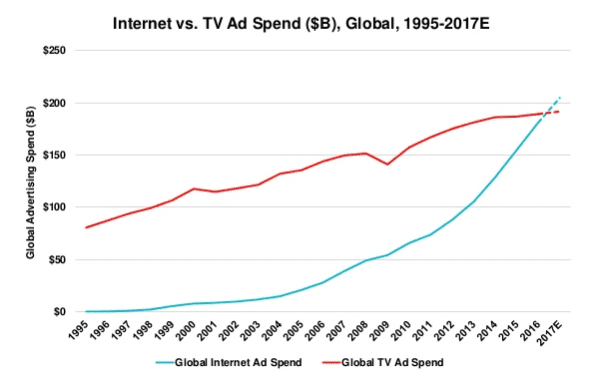 Online ad-spend surpassed TV spend in several mature markets a few years back. But now we have reached the watershed moment where online ad spend is higher than TV spend globally.