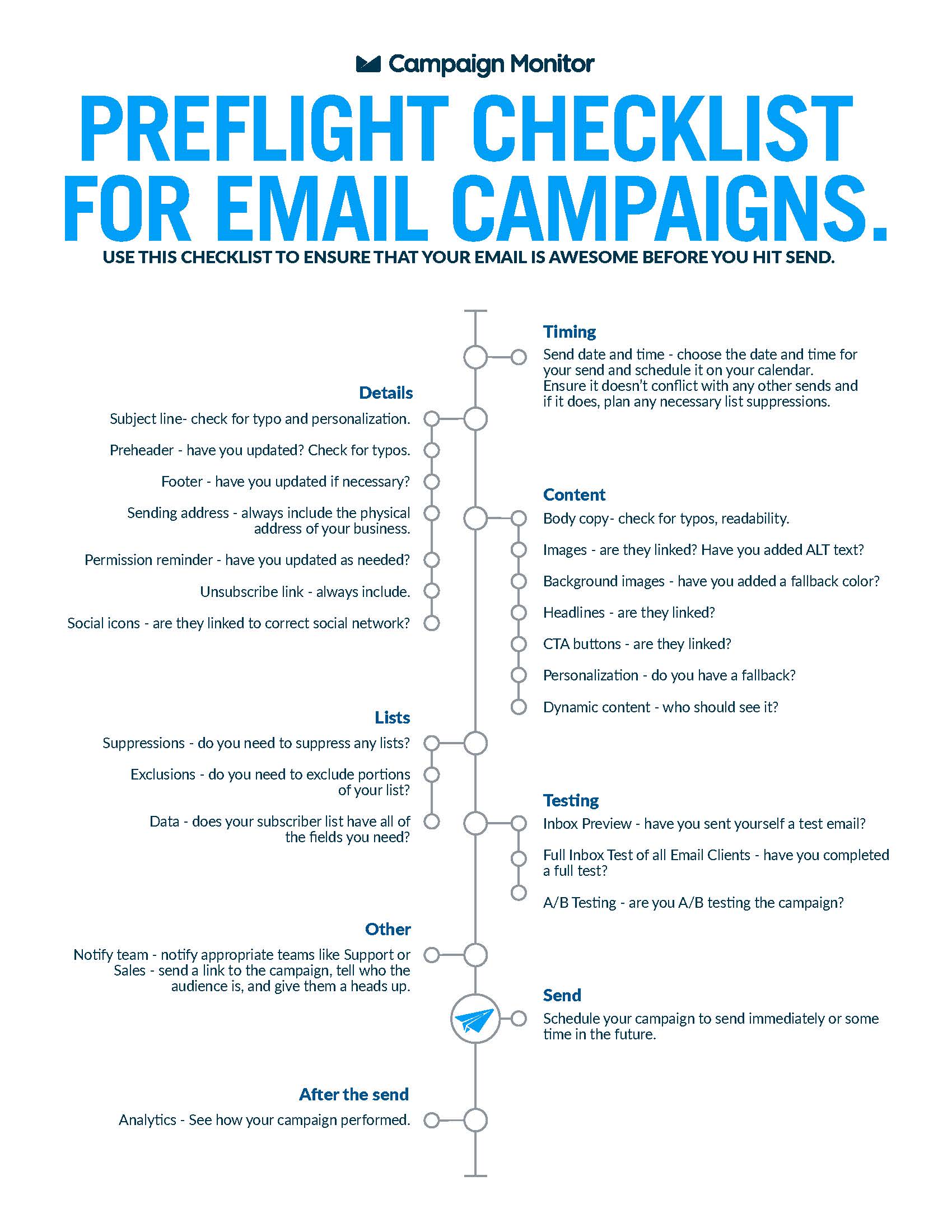 To help alleviate this sending fear and also avoid the most common email errors, Campaign Monitor is happy to share this email campaign preflight checklist. It covers each part of an email, like subject line, checking links, and content, and also helps with other aspects of a send that you may not have thought about like testing and analytics.