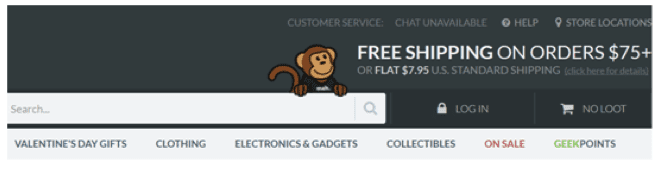 ThinkGeek offers free shipping at a minimum value of $75 to encourage a higher order value. A purchase with a lower order value will pay a flat rate of $7.95. This shipping policy is disclosed in the beginning using the top banner, which enhances the shopper’s trust in the company.