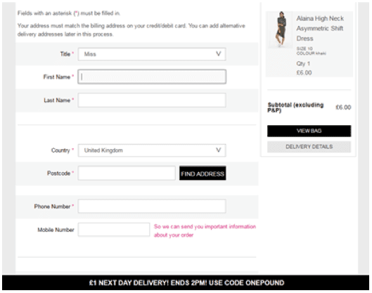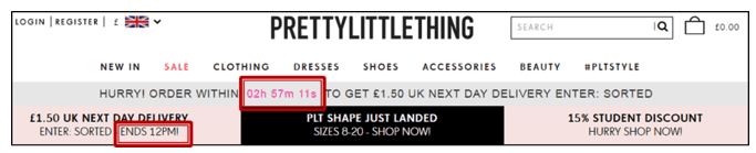 Prettylittlething offers free shipping for purchases made within 3 hours of entering the site and a next day delivery at an extremely low cost for purchases made by the end of the day. Both options utilize a sense of urgency to encourage fast purchasing.