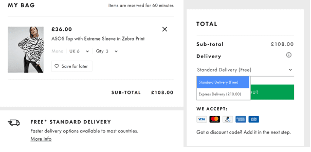 The way in which ASOS offers free shipping is insufficient. There are only two options and there is no indication of how fast the express delivery is. The full explanation may be in the FAQ page, but a shopper may not bother to check it and leave instead.
