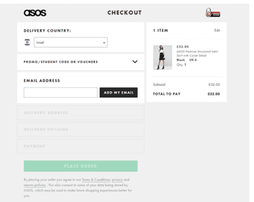 ASOS shows how this can be done properly. The checkout has 4 steps. Each one is short and has one, clear CTA to continue to the next step. Once the CTA is clicked on the next step is automatically revealed, with the final CTA being the “place order” button.