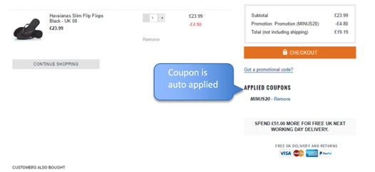 Another option is to have a set banner with the coupon code which the customer can see on the checkout page as well, as boohoo does.