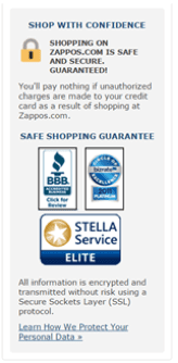 Zappos displays security logos on each page of the checkout process to reiterate safety. If a customer clicks on “more information” they can read about SSL technology, VeriSign cooperation, firewalls and more. There are also numerous customer reviews.