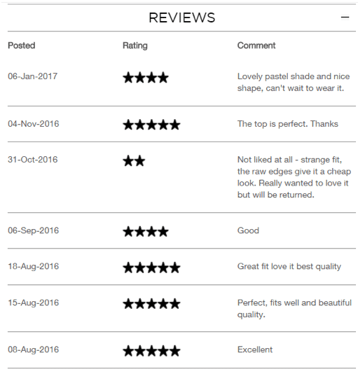 French Connection is an excellent example for providing customer input (and having much of it). On the product page, the customer can see each person’s review and rating as well as the date it was posted in a clear manner.