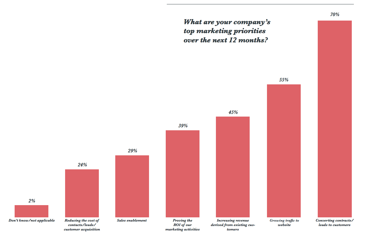 The majority of respondent prioritized converting leads to customers (70%) and attracting visitors to their site (55%) whilst considerably less (29%) said sales enablement was a top priority.