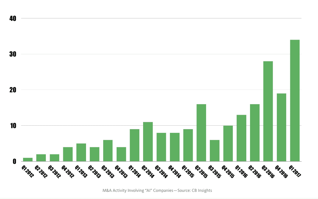 The chart below shows how many companies acquisition deals have occurred involving AI companies in the past 20 quarters. What we are seeing is the growing realization of the power of AI tech, and thus a scramble to acquire AI startups that have made technological advances. Acquisitions in the first quarter of 2017 were fully three times higher than the first quarter of 2016. Expect acquisitions this year to become product features in some of the biggest tech companies next year, like Google, Facebook, and big software providers.