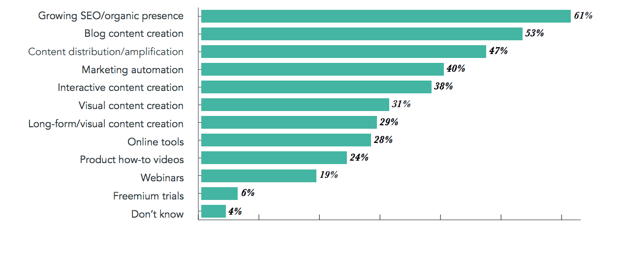 It seems that companies are prioritizing SEO and content marketing in their inbound marketing projects and pushing freemium trails (6%), webinars (19%) and product how-to videos (24%) further down the priorities list.