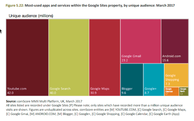 Video is also increasing in popularity fuelled by social . This breakdown of Google popularity shows the dominance of YouTube. We used to say that YouTube was the second biggest search engine, but this data shows that it is now more popular than Google Search based on number of users in a given month (this research also from the comScore panel via Ofcom).