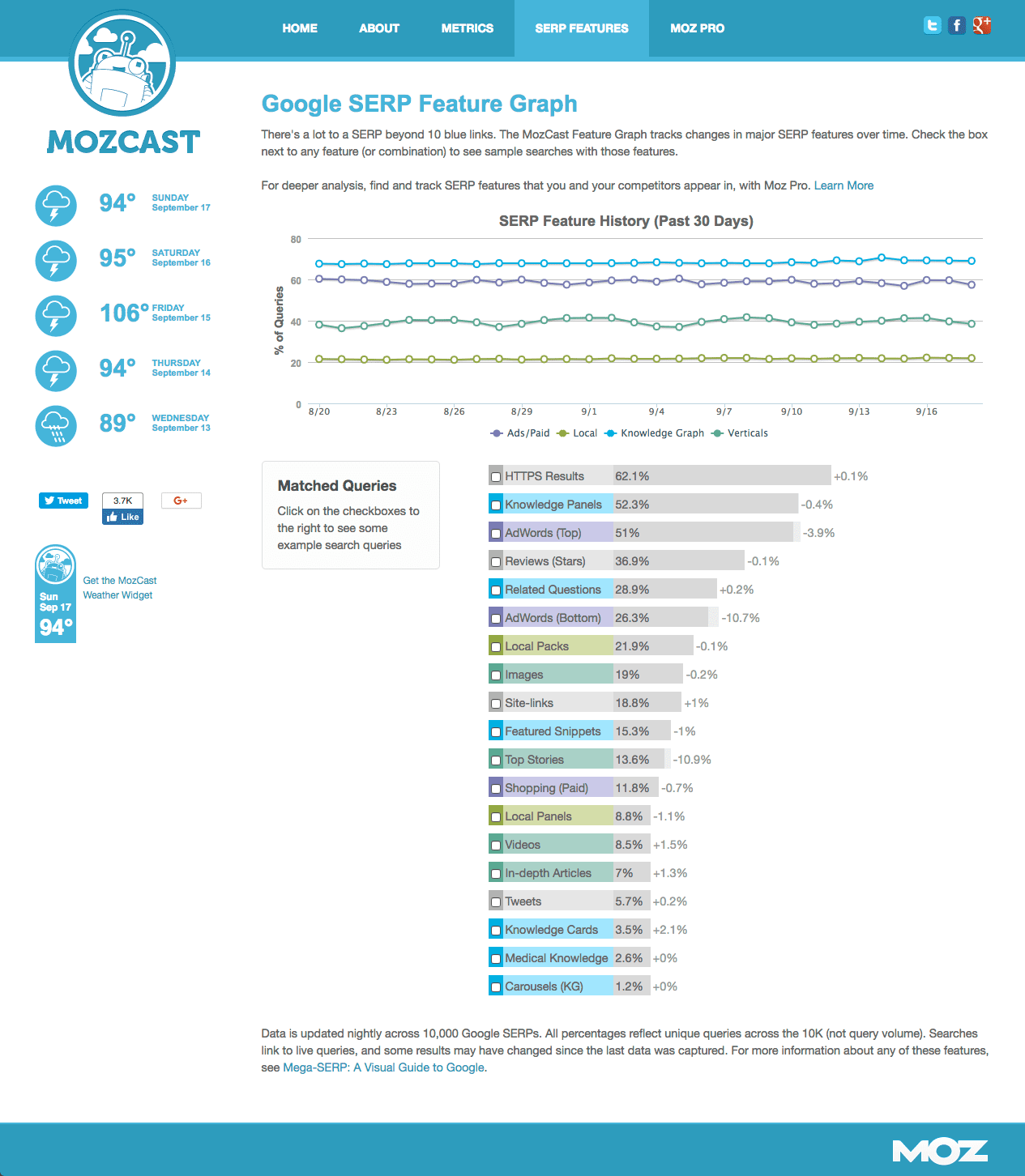 Within organic search, one trend I think marketers should be aware of is the changing face of the SERPs as shown by the Mozcast SERPs features update which shows the types of links within a bundle of top 10k keywords they monitor.