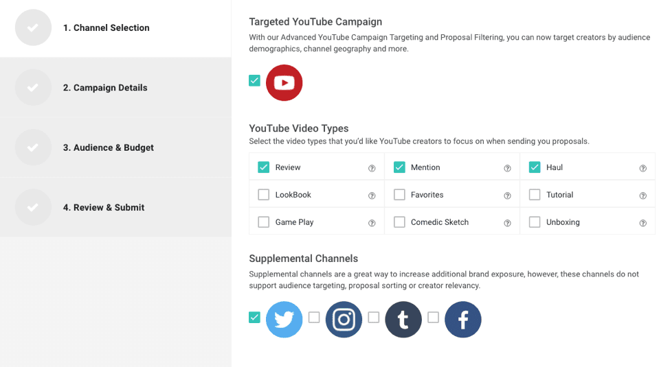 Based on your goals, you can then determine which platforms and formats you’d like to target for your campaign. Keep in mind that the end goal of any influencer marketing campaign is the creation of some form of content. It can be a YouTube video, an Instagram post, a pin on Pinterest, a Tweet, or a blog post.