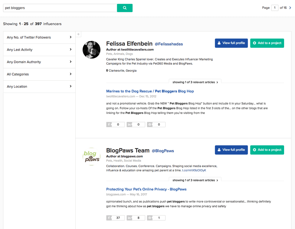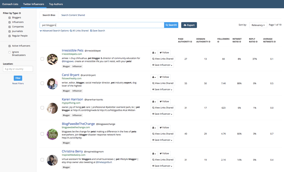 Buzzstream (which we’ll discuss again below) is one of the most popular CRM tools for managing communications with influencers. However, they recently launched an influencer discovery service called Buzzstream Discovery which is another great way to find influencers.